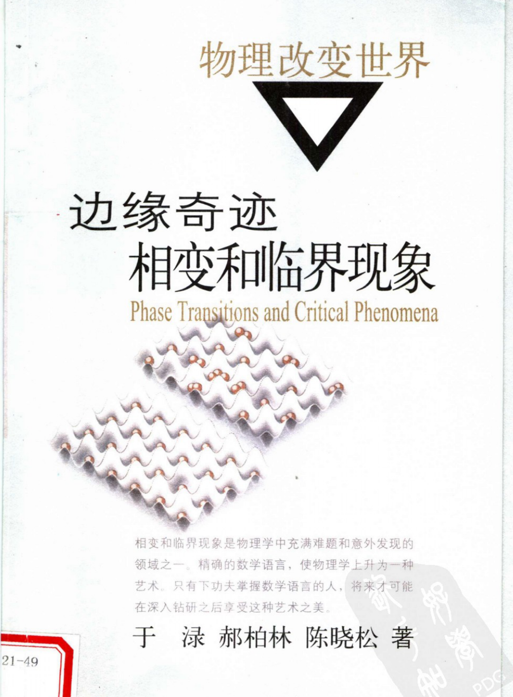 《边缘奇迹:相变和临界现象》通过对相变和临界现象的介绍,阐述热力学和统计物理的基本概念,从熵的引入、统计配分函数,到对称破缺、标度律和普适性。本书描述了研究相变现象的基本理论方法,包括平均场近似、标度分析、重正化群、统计模型精确解和计算机数值模拟等。书中还介绍了相变研究的最新进展,如有限系统的临界现象和量子相变。相变和临界现象是物理学中充满难题和意外发现的领域之一。