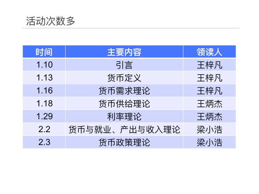 • 每次都有一个核心主讲人,除了读书外需要投入额外的准备时间