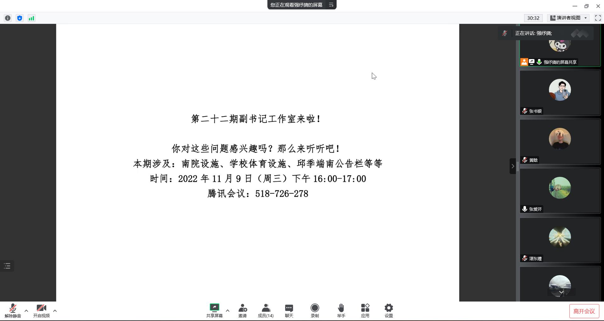 2022年11月9日下午16:00,swag免费影片 组织开展了第二十二期“副书记工作室”交流会,聚焦南院设施、学校体育设施、邱季端南公告栏等话题。本次会议由于疫情线上举行,党委副书记张爱芹老师与会,研究生会权益部副主席强纾旖主持。以下是问题解答: