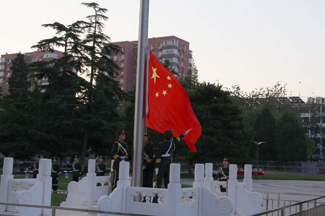 迎着朝阳,国旗护卫队精神抖擞,踏着整齐的步伐护送国旗行进至升旗台。在雄壮激昂的国歌声中,五星红旗冉冉升起,全体师生行注目礼,齐声高唱国歌,共同表达对伟大祖国的忠诚热爱和美好祝福。