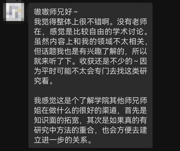 我们通过创建群文档,个人谈话等方式发现,同学们对该活动很感兴趣,甚至给部分同学当前的科研带来了新的启发,大家普遍希望能再次举办。以下为部分同学的反馈: