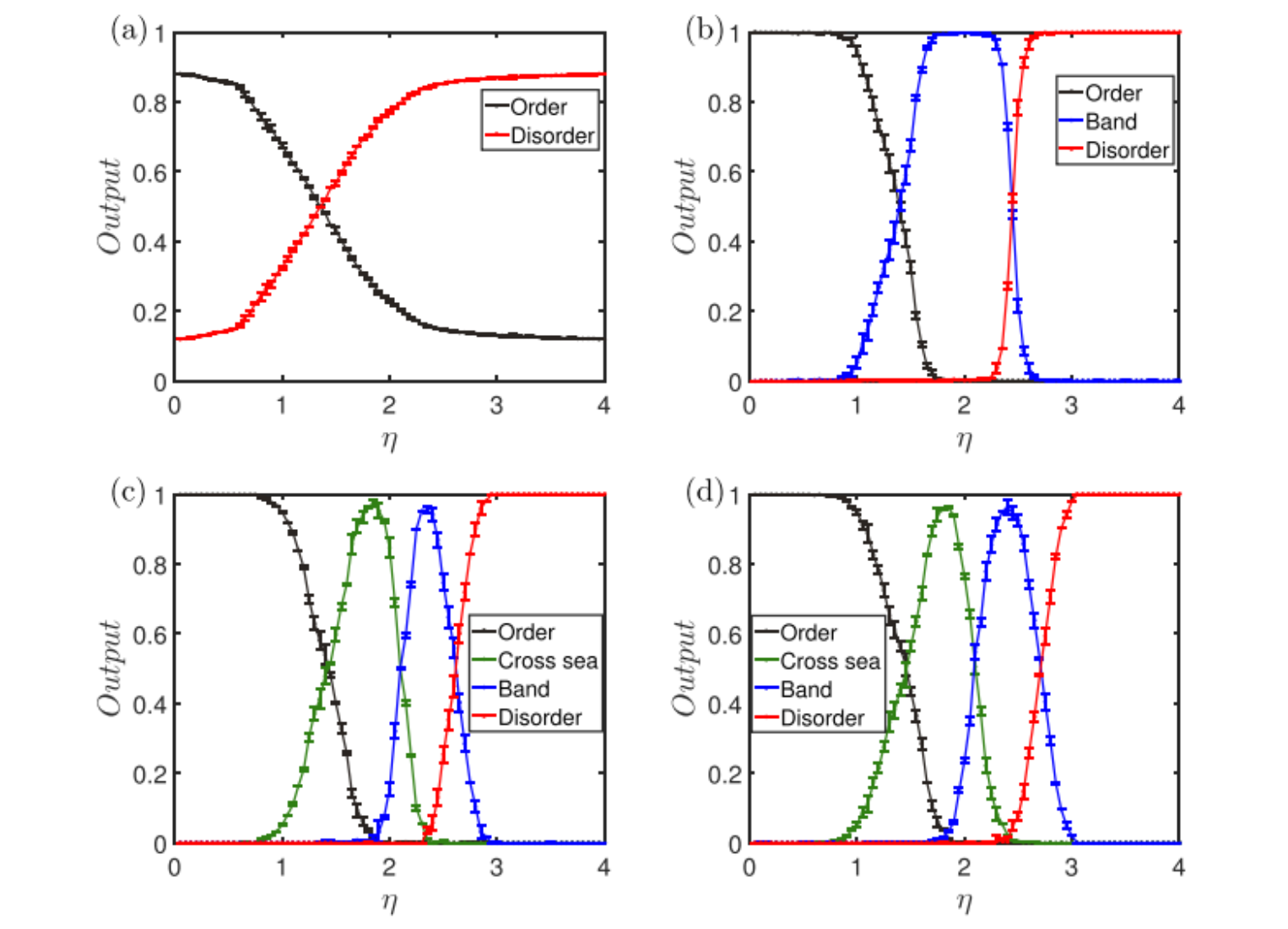 集群系统作为一种新型的非平衡系统出现,成为近几年许多实验和理论研究的主题。由于理解集群系统的非平衡性质方面具有巨大挑战,通常利用最小模型来捕捉其中的物理原理。其中最著名的是Vicsek模型[1],它大大提高了我们对背后物理原理的理解。该模型由自驱动粒子所组成,用相变来描述集群行为的变化。在以往的研究中认为该系统存在三个相:类似气体的无序相,类似液体的有序相,以及有序-无序的共存相。然而,在最新研究发现Vicsek模型的第四个相:cross sea相,这个新相并不是简单的两个波叠加,而是具有固有交叉角的独立复杂图案。因此,在Vicsek模型中确定了四个不同的相:有序相、cross sea相、band相和无序相。然而,精确地识别这些相变点现在变得极其具有挑战性。