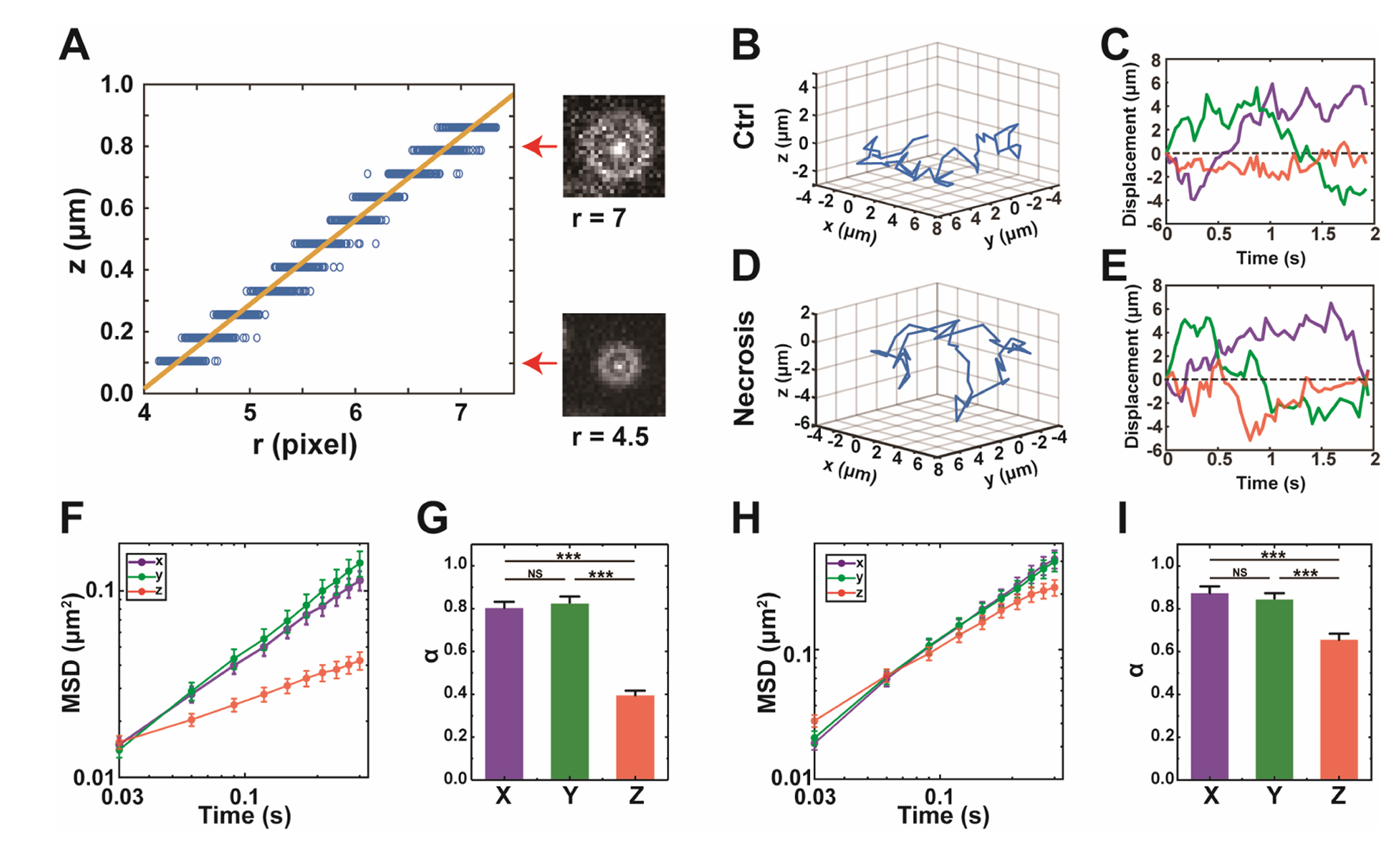 图3三维单颗粒示踪结果表明细胞内扩散由各向异性趋向于各向同性转化,纵向扩散不再受限