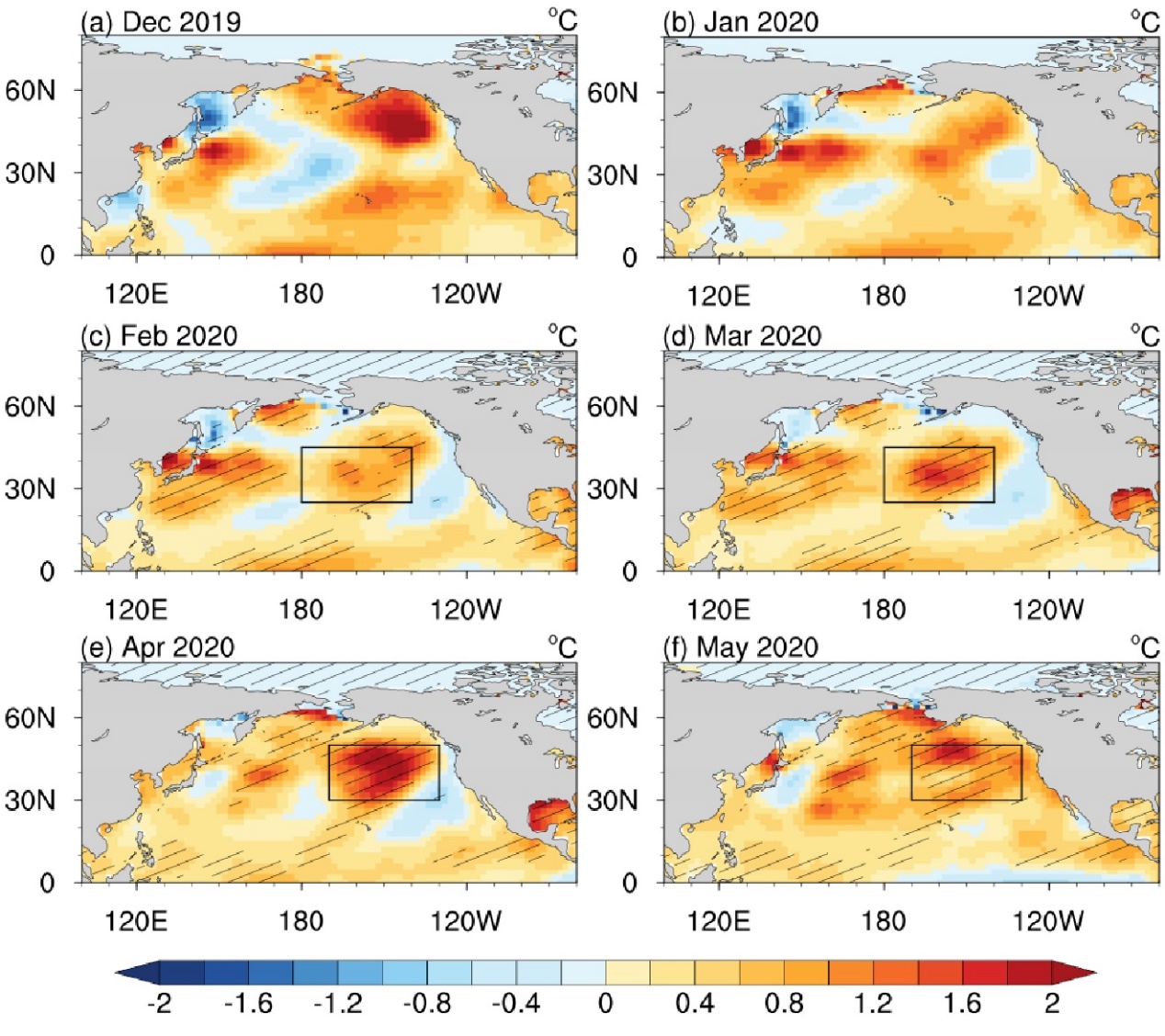 图1:北太平洋SST异常空间分布,(a-b)分别为2019年12、1月,(c-f)分别为2020年2月、3月、4月和5月。单位为℃。间隔为0.2℃。黑色方框表示SST暖异常最强的区域,2-3月期间位于25°-45°N和180°-140°W,4-5月期间位于30°-50°N和170°-130°W。阴影区域代表SST异常超过SST标准偏差。