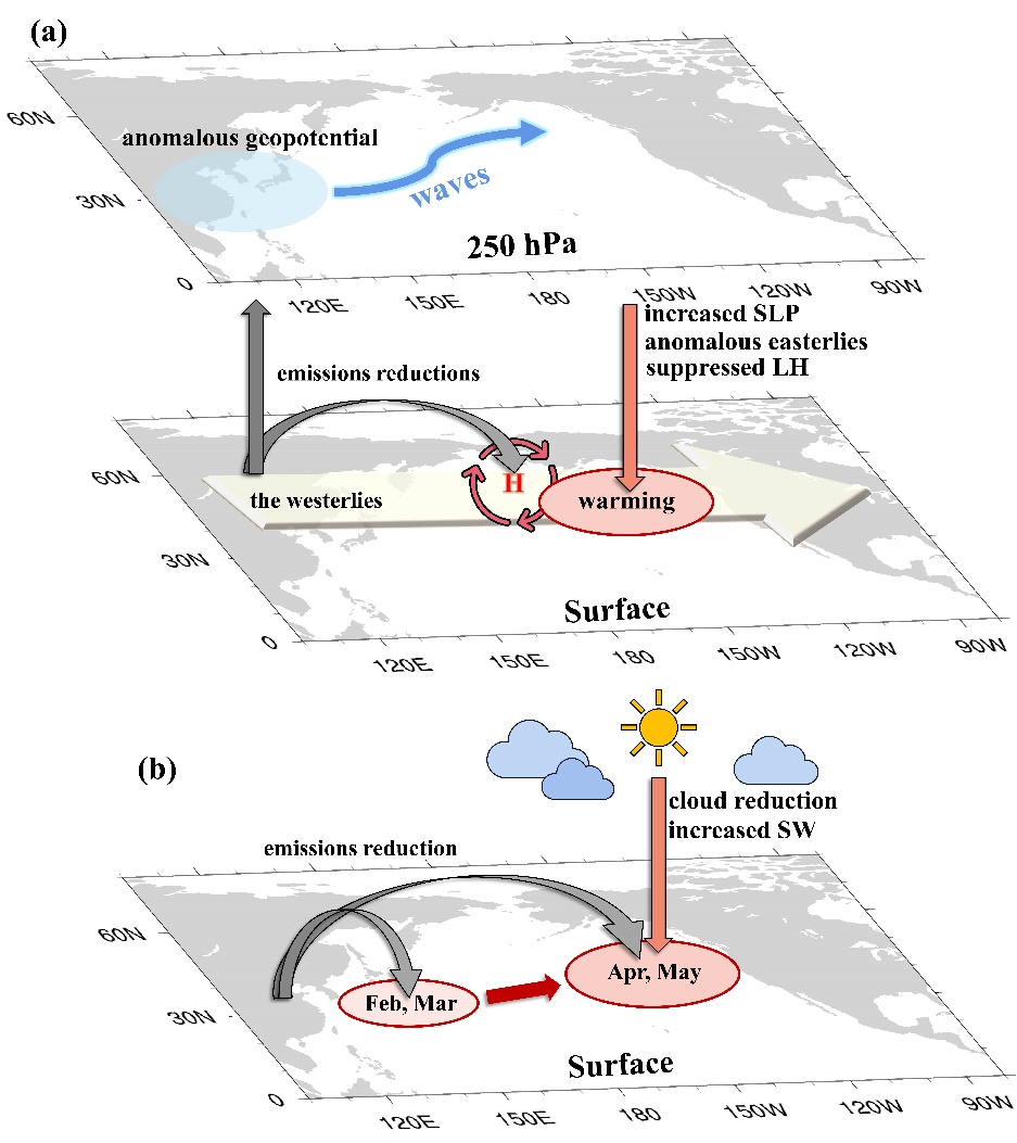 研究结果表明,COVID-19期间的减排可能为2020年春季东北太平洋热浪的产生贡献了约28.5%。一方面,东亚气溶胶减排激发了从东亚到东北太平洋的Rossby波列,导致中纬西风减弱和北太平洋蒸发减少,使得海洋表面温度升高。另一方面,气溶胶排放减少,导致下风向位置的北太平洋气溶胶含量减少,进而改变北太平洋上空的云层。这种气溶胶的间接辐射效应对海洋热浪的产生也有一定的贡献(图2)。