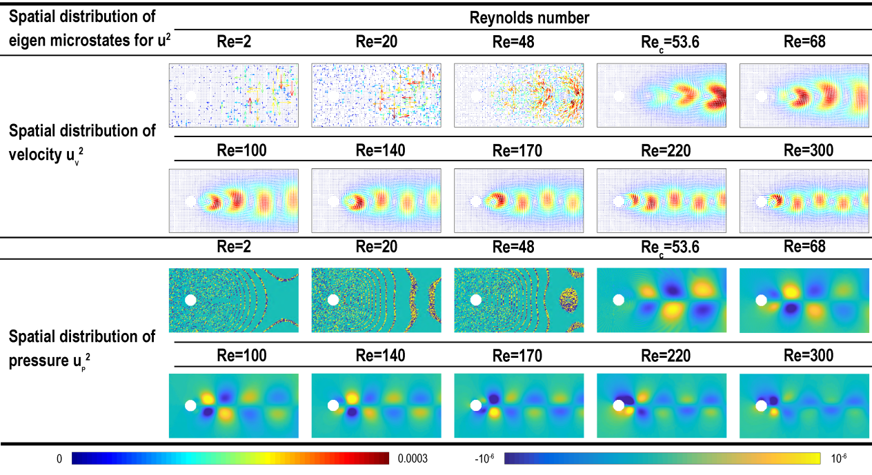 图2:第二本征微观态在不同雷诺数下速度和压力的空间分布。上部是速度的空间分布,用一组箭头表示。箭头方向表示速度方向,颜色表示速度大小,从蓝色(低速)到红色(高速)。下部显示了压力的空间分布,用颜色强度表示,颜色越亮表示压力越高。