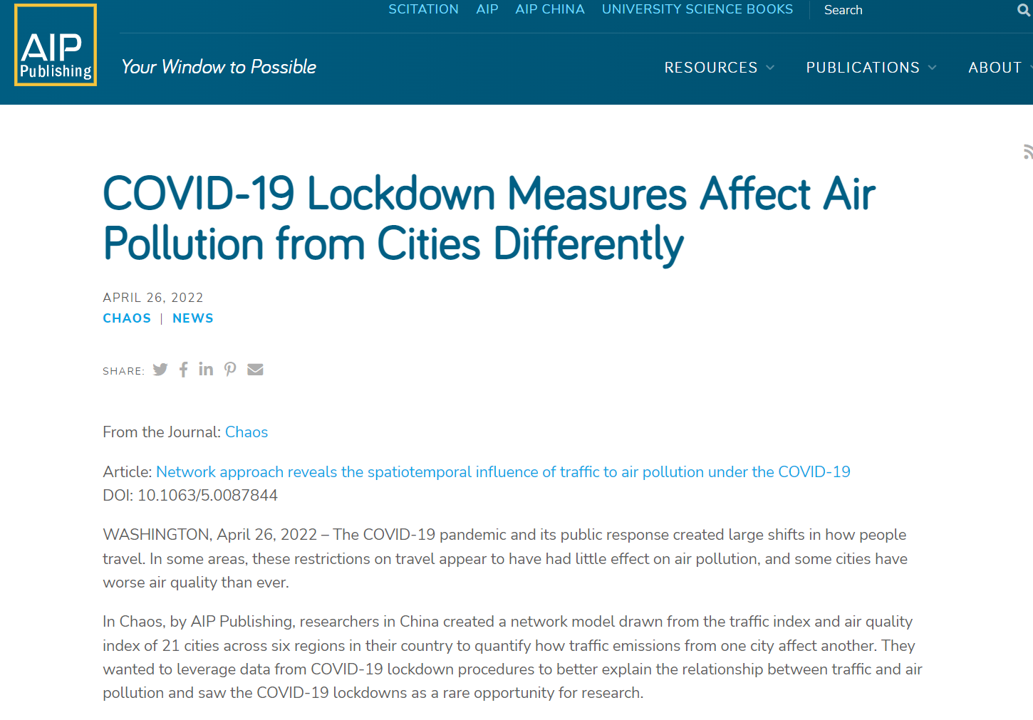 美国物理联合会AIP官网报道国家安全与应急管理swag免费影片 汪伟平、杨赛霓和swag免费影片 樊京芳等对COVID-19 封锁措施对城市空气污染的影响研究的新进展。随着冠状病毒(COVID-19)大流行席卷全球,许多国家实施了严格的封锁政策以阻止疾病的传播。这些政策减少了人类的流动性,特别是限制了交通活动,本应改善环境空气质量。然而,在 COVID-19 封锁期间,全球城市地区的整体空气质量并未得到改善。此外,随着世界因放宽行动限制而逐渐重新开放,一些城市的空气质量在恶化,如印度城市的空气质量较之2019年以前更差。该研究试图深度理解如何解释这些违反直觉的发现。研究发现单方面改变本城市交通并不会改善空气质量,而是需要区域整体的调整,污染物的跨区域传播为其潜在的驱动因素。