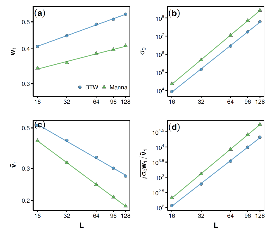 图1. 吸收态向自组织临界态的演化与本征微观态的凝聚。(a)和(b)展示BTW模型的结果,随机规则的Manna模型的结果展示在(c)和(d)。