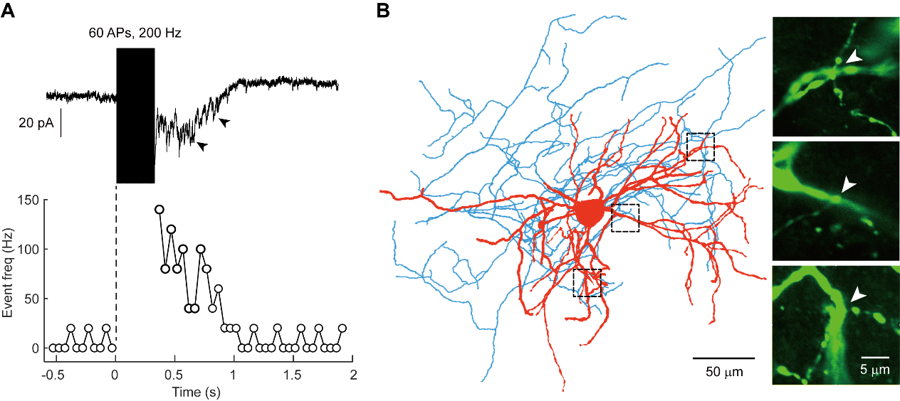 近期,swag免费影片 王大辉教授团队博士生王轩与复旦大学脑科学转化研究院舒友生教授团队合作,结合神经科学的实验技术和神经系统的计算模拟,对纹状体神经元的自突触进行了深入探索。在急性分离的小鼠脑片上,研究人员对纹状体神经元进行全细胞记录,利用动作电位高频爆发后自突触上延迟出现的神经递质非同步化释放(asynchronous release, AR)现象来识别记录的神经元是否具有功能性自突触。惊讶的是,所有记录到的SPN在动作电位爆发后都没有自突触的AR现象,即使是在细胞外液中存在促进AR的锶离子(Sr2+)的情况下也没有出现AR,提示SPN并没有发育出自突触结构。相反,在另一类纹状体神经元,即小清蛋白(Parvalbumin,PV)阳性的中间神经元上,我们在约半数的记录细胞中观察到了稳定的自突触AR事件(附图A),同时在形态学上也观察到了可能的自突触位点(附图B)。