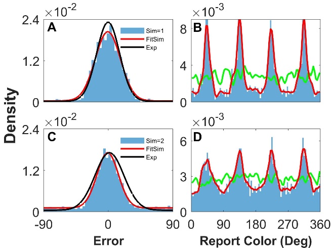 近期,swag免费影片 王大辉教授团队,通过神经动力学建模与数值模拟,揭示了聚集报告现象与报告偏差分布的可能神经动力学机制。团队成员利用环状神经元网络,将不同颜色便好的兴奋性神经元按照偏好特征放置在圆环上,表征色环上相应角度的颜色。研究发现当兴奋性神经元之间的突触连接为异质性,且这些突触连接具有短时可塑性(Short-Term Plasticity),网络模型可以较好地复现出实验中的现象。如附图A,C所示,模型所得到的报告的偏差分布(蓝色柱状图)是高斯形的,且与实验分布(黑线)接近。附图B,D表示报告分布(蓝色柱状图)呈现出明显的多峰特征,偏离了刺激的均匀分布(绿色曲线)。