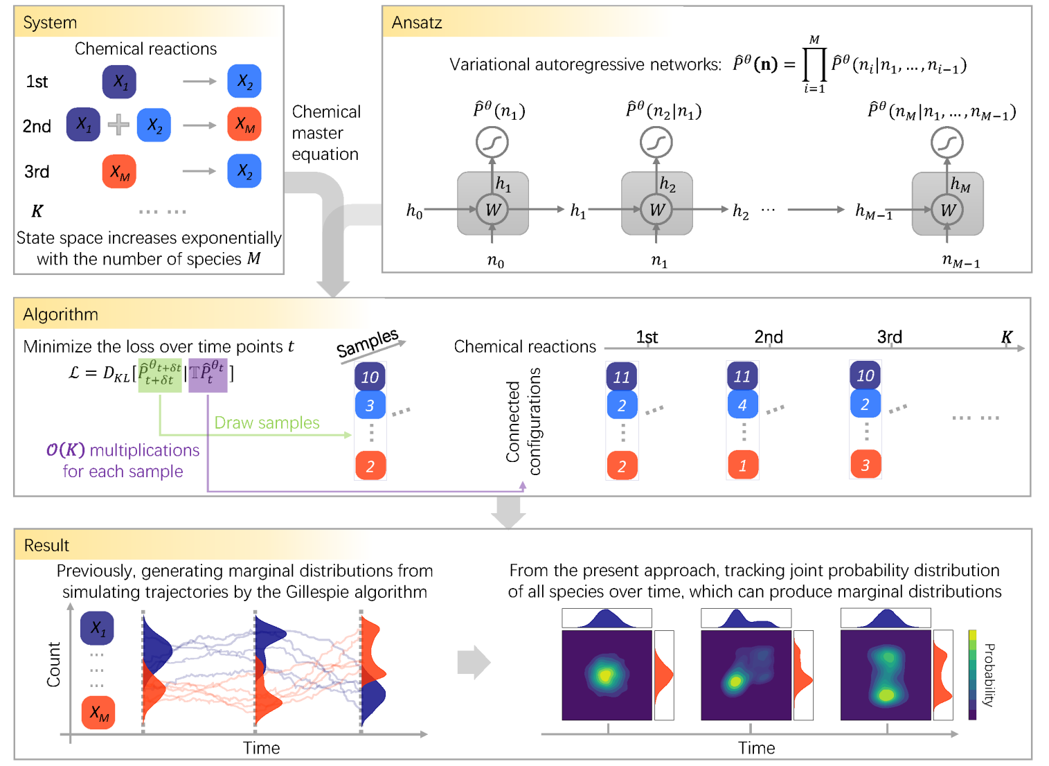 3月16日,swag免费影片 系统科学学科,联合中科院理论物理所的合作者,在Nature Machine Intelligence(自然-机器智能)发表论文Neural-network solutions to stochastic reaction networks,提出了一种使用变分自回归网络来求解化学主方程的机器学习普适方法。