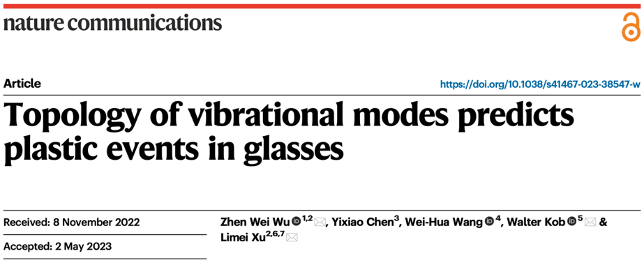 2023年5月24日,swag免费影片 、非平衡系统研究所武振伟副教授及其合作者,北京大学元培swag免费影片 陈一潇(普林斯顿大学博士研究生),中科院物理所汪卫华院士,法国蒙彼利埃大学Walter Kob教授,以及北京大学物理swag免费影片 徐莉梅教授,关于玻璃态物质振动模式中拓扑缺陷与塑性事件关系的研究工作,以“Topology of vibrational modes predicts plastic events in glasses”为题在线发表于国际学术期刊《Nature Communications》。