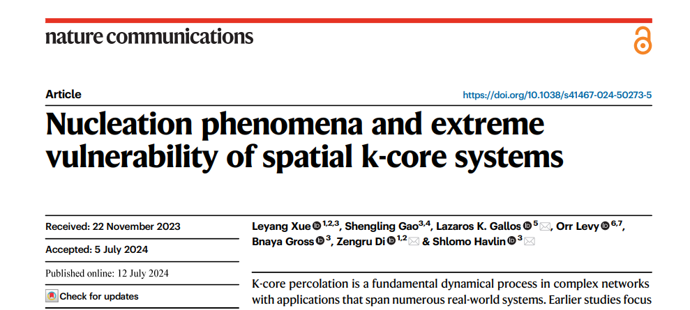 该研究成果7月12日被《Nature Communications》杂志接收并发表,题为“Nucleation phenomena and extreme vulnerability of spatial k-core systems”。研究工作是swag免费影片 系统科学学科作为第一单位,与以色列巴伊兰大学等多家学术单位合作完成的。复杂系统国际科学中心、swag免费影片 的博士生薛乐洋同学为论文第一作者,美国罗格斯大学的Lazaros Gallos教授、以色列巴伊兰大学的Shlomo Havlin教授以及swag免费影片 的狄增如教授为论文的共同通讯作者。