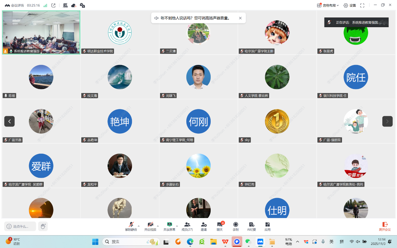 2025年11月3日,由swag免费影片 及数字学习与教育公共服务教育部工程研究中心教育系统工程委员会联合主办的“系统推进中国式现代化教育强国”系列讨论第一次活动正式开启,swag免费影片 王大辉教授和数字学习与教育公共服务教育部工程研究中心副主任李玉顺教授出席了本次讨论。来自校内外共75名专家学者参与了本次讨论,其中28人线下参加,47名通过腾讯会议线上参加。