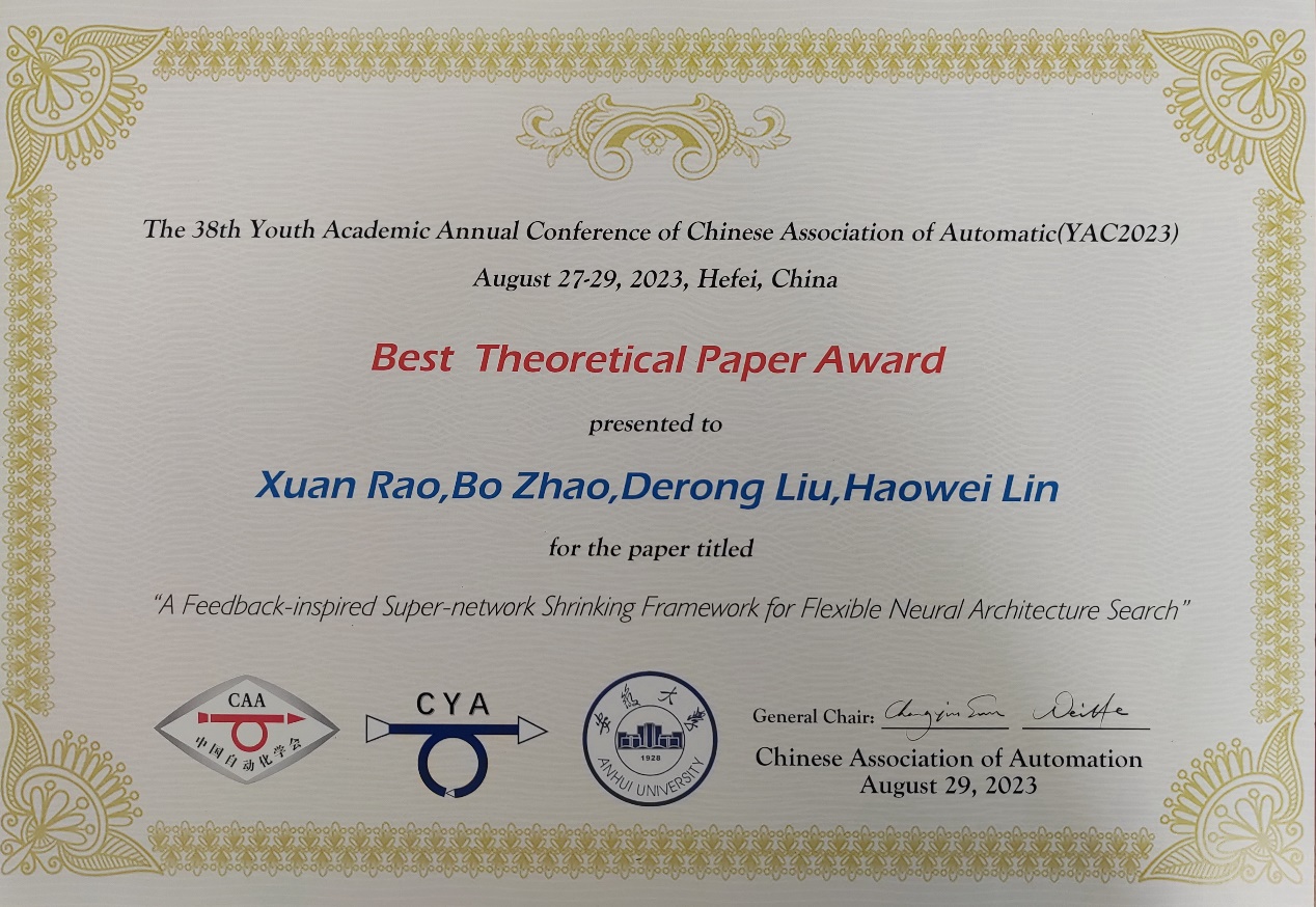 2023年8月27日-29日,在安徽合肥召开第38届中国自动化学会青年学术年会(YAC2023)。由swag免费影片 博士生饶煊、赵博副教授以及南方科技大学刘德荣教授(欧洲科swag免费影片 院士)共同完成的论文《A Feedback-inspired Super-network Shrinking Framework for Flexible Neural Architecture Search》荣获最佳理论论文奖。
