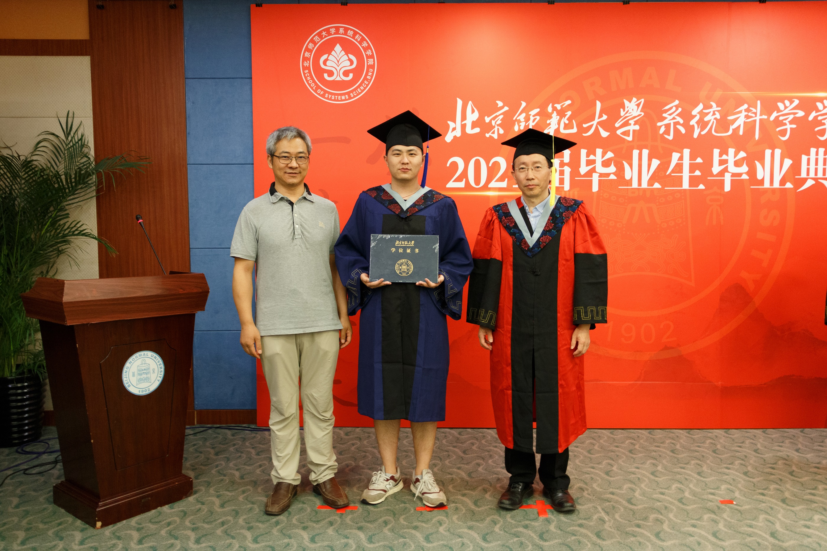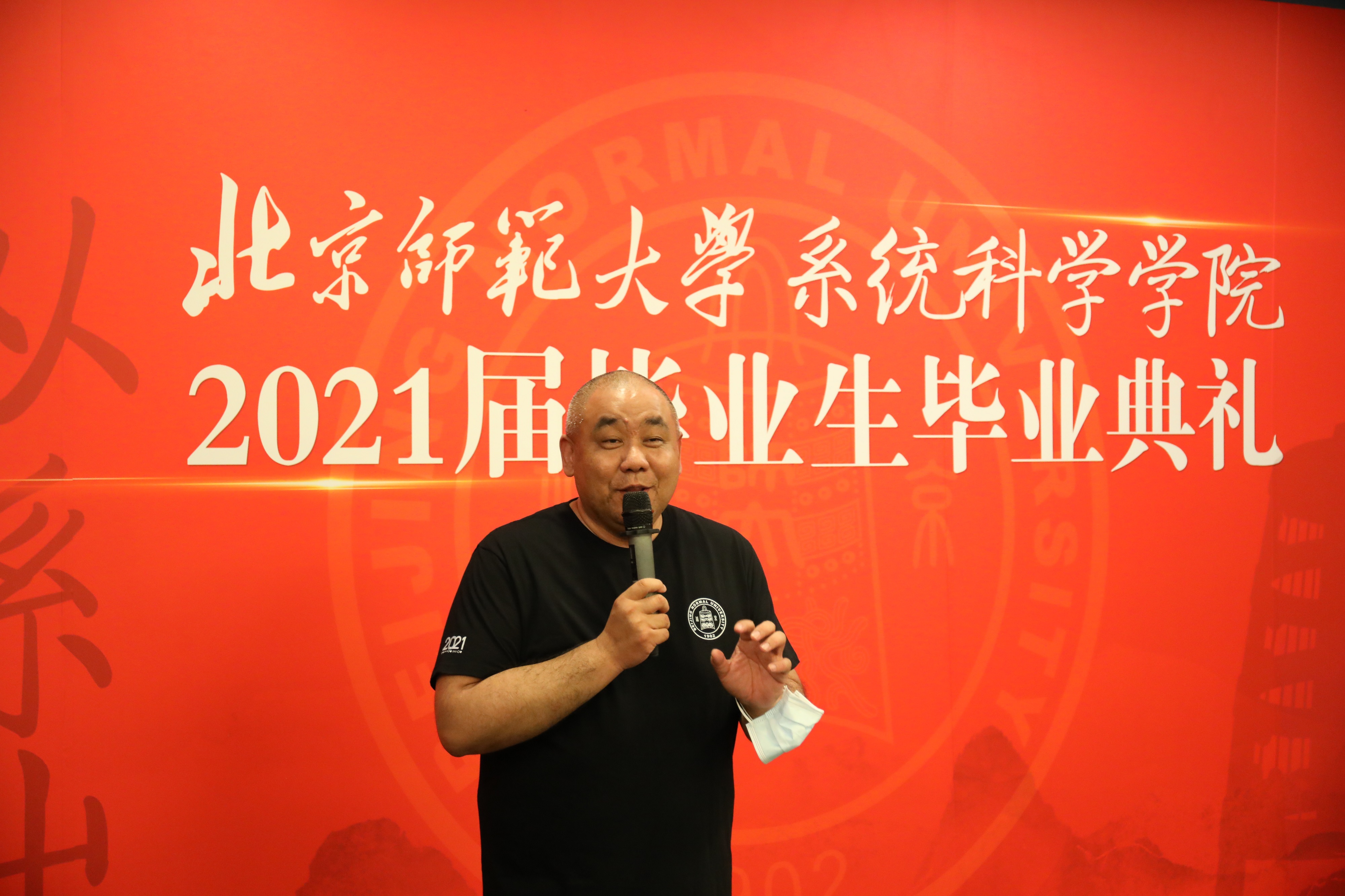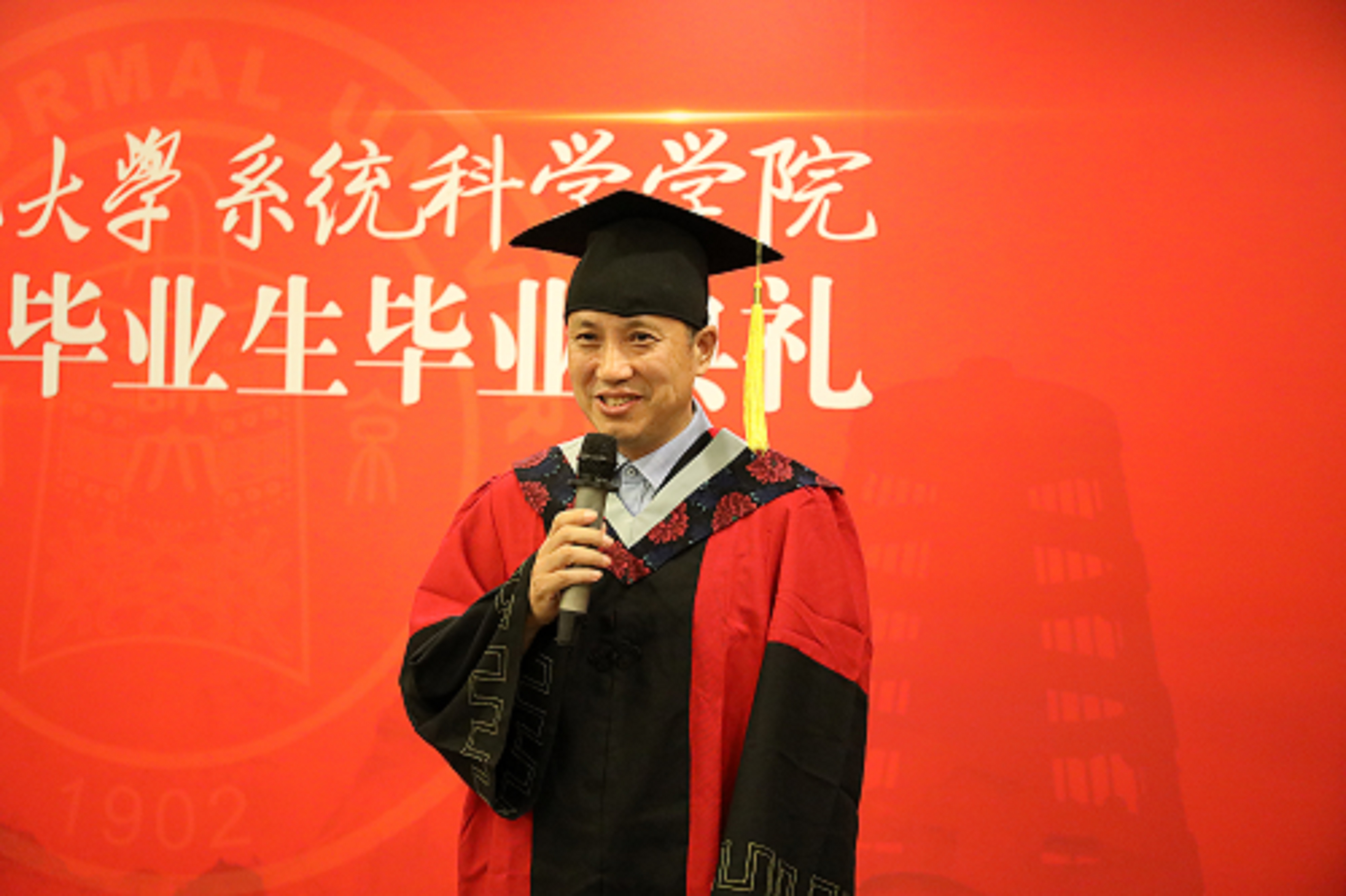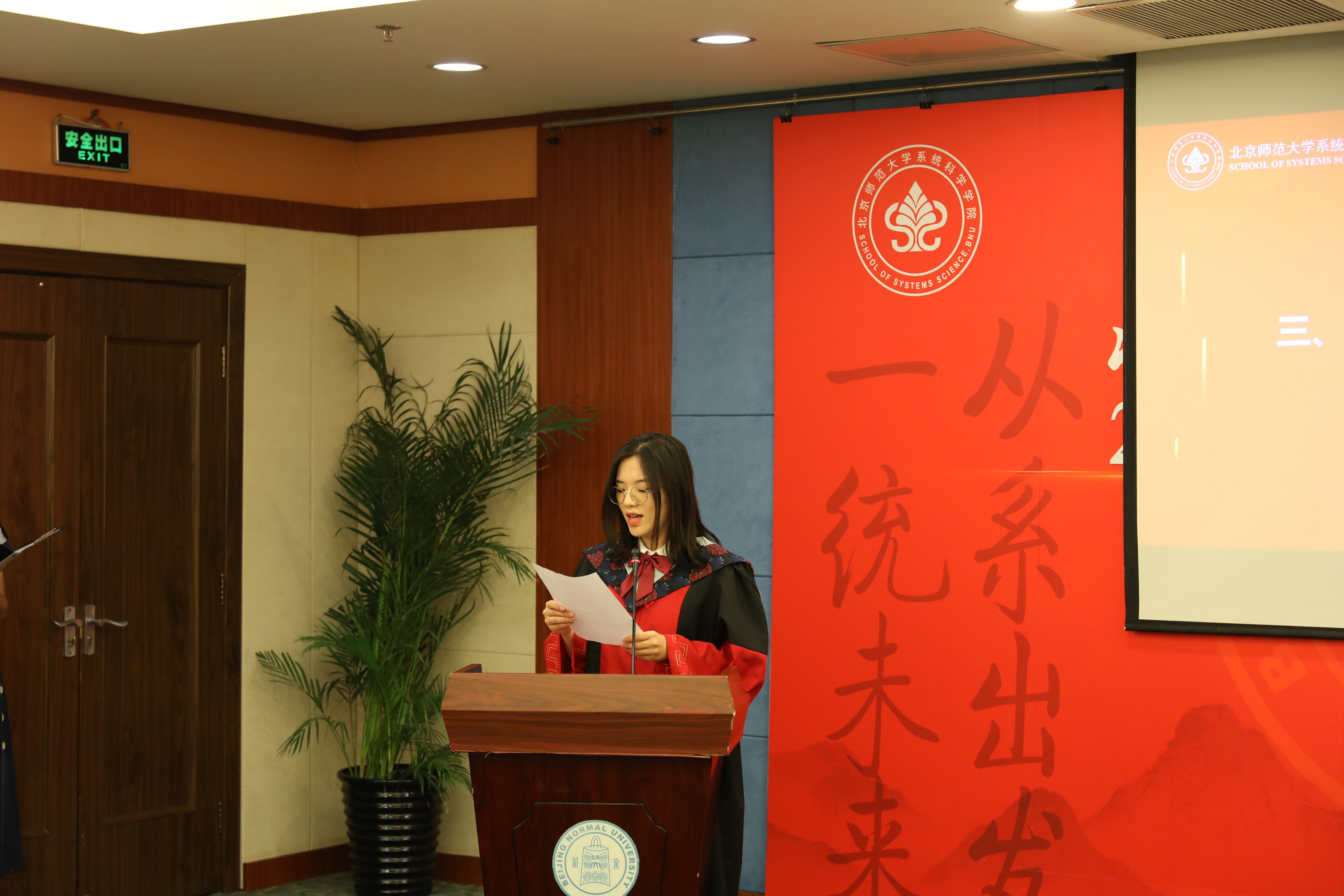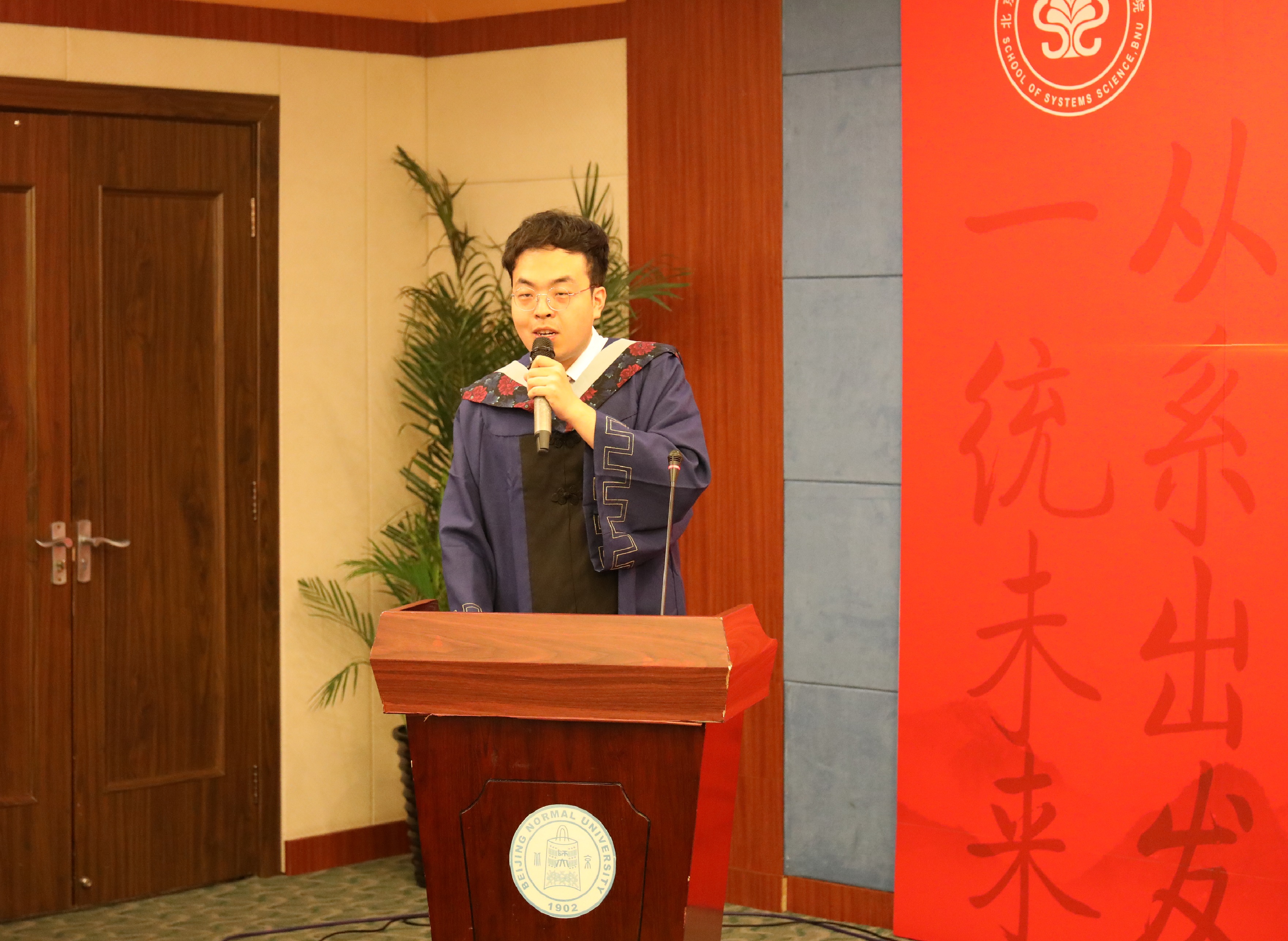 下午14:00,毕业典礼正式开始。在庄严的国歌声中,毕业典礼正式拉开帷幕。首先,毕业班班主任武振伟老师发言。他希望大家走上新的岗位后,能够继续加强学习,提升发展空间,实现自我价值。最后他以北宋大家张载的横渠四句:“为天地立心,为生民立命,为往圣继绝学,为万世开太平”作为结语。祝愿毕业生能够继承北师大的红色基因,为国家和民族发展贡献力量。随后,博士毕业生代表董馨月回忆在校几年的美好时光,并对老师和同学们表示感谢与祝福。硕士毕业生代表张亮回想当年难忘的点滴,并表达了对学校、对老师同学们的不舍和对未来的期许。