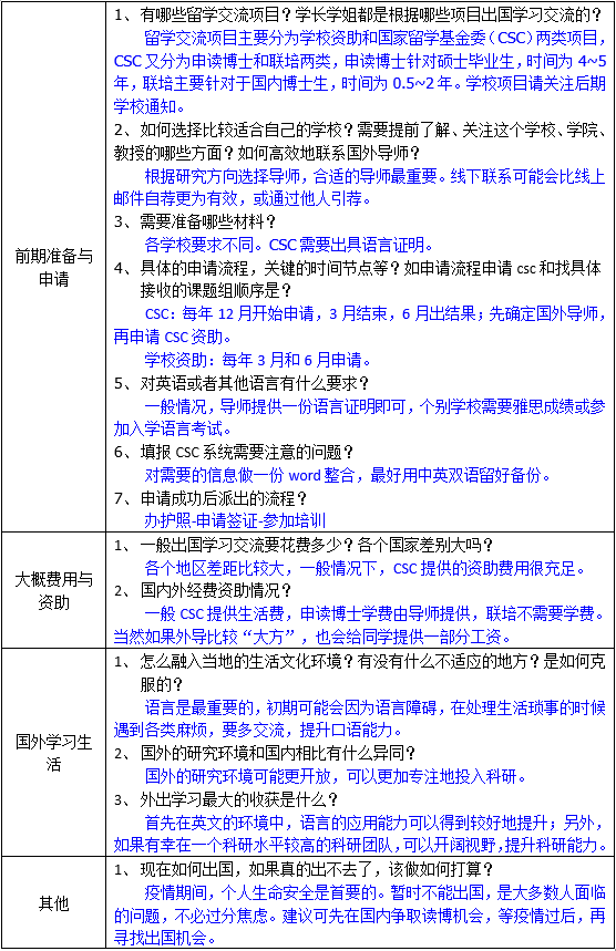 会上各位师兄师姐详细解答了同学们们关于前期准备、申请流程、资助经费来源、国外学习生活等方面的具体情况。相关问题及回复如下: