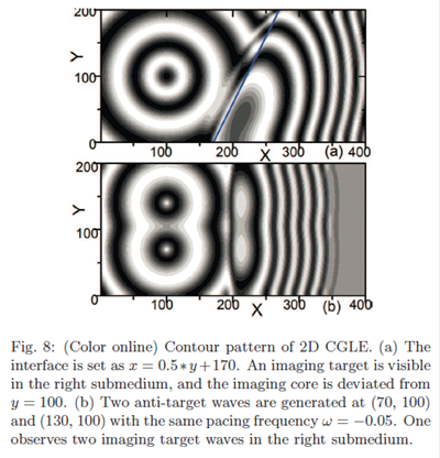 Fig1. Target wave imagery is observed in the right medium. The imaging target waves are NWs which are observed by continuous snapshots of spatial patterns. In other words, the pacing-generated target waves which are AWs propagate, crossing the interface, and then form the imaging target waves in the right medium.
