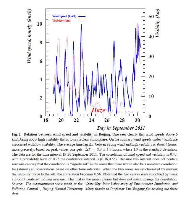 1、北京的能见度和风级有明显的相关性,6km/h以上大风大多都能对应较好的能见度和空气质量,大风和高能见度的出现之间有3.8+-1.9小时的时差;