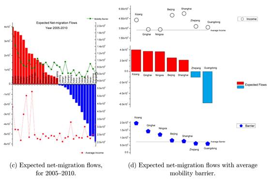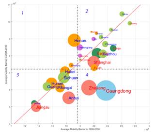 图1描述了近20年间省际人口迁移壁垒的变化情况,x轴代表1995-2000年的迁移壁垒,y轴代表2000-2005年的省际迁移壁垒,每个圆点代表一个省市,它的面积大小与净迁移流量有关,红色表示迁移流量为正,蓝色代表迁移流量为负。位于红色的对角线上的圆点,他们的迁移壁垒基本没有发生变化,红线以下的省市变得更吸引人了。比如在第4象限的浙江和广东,它们的迁移壁垒与90年代相比,有了明显的下降,吸引了更多的潜在迁移人口;而红线以上的省市则变得不那么吸引人了。