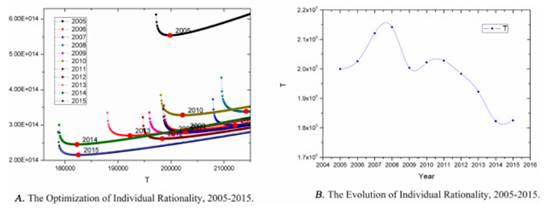 此外,对于个体理性的分析也得到了有意思的结果。在2005-2015年期间,美国国内移民的个人理性总体上有所提高(图4 A)。 但是,在2007年和2008年,个人理性显著下降。 人们普遍认为上一次美国经济危机始于2007年。一开始,经济危机影响了移民决定的个人合理性。 后来,个人调整了自己的收益预期和其他预期,并逐渐减少了长期趋势中与当前合理性的偏离(图4 B)。