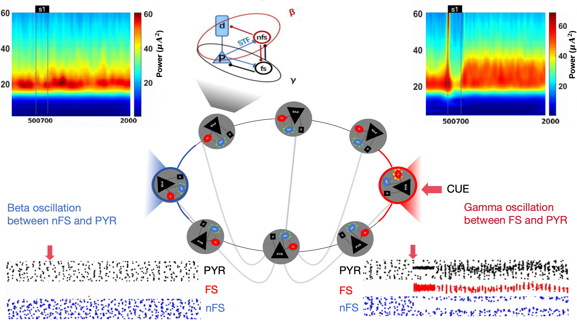 美国神经科学学会主办期刊eNeuro最近发表了王大辉课题组的相关研究 “Gamma and Beta Band Oscillation in Working Memory given Sequential or Concurrent Multiple Items: A Spiking Network Model”。该工作建立了由两房室锥体细胞(Pyramidal cells:Pyr)、高阈值快发放(High-threshold fast-spiking:FS)、低阈值慢发放(Low-threshold non-fast-spiking:nFS)中间神经元构成的放电神经网络模型。由于模型中神经元具有偏好特性,该模型支持同时呈现和序列呈现信息的工作记忆任务。模型显示:在刺激呈现前网络主要依靠Pyr和nFS的相互作用产生Beta频段的振荡,在刺激呈现后,Pyr活动增强激发FS的活动,Pyr和FS之间的相互作用产生Gamma频段振荡,而FS抑制nFS的活动导致Beta振荡减弱,体现了nFS在无任务时为网络提供基础性的抑制作用而在工作状态时依靠FS来控制信息流动的分工机制。该模型结果和此前关于小鼠初级视皮层中SOM和PV神经元参与调节视觉刺激诱发的Beta和Gamma振荡的实验结果相符。