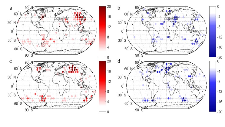 (a)和(b)为正负向加权出度(CO2浓度传出),(c)和(d)正负向地表温度加权入度(传入到地表温度).