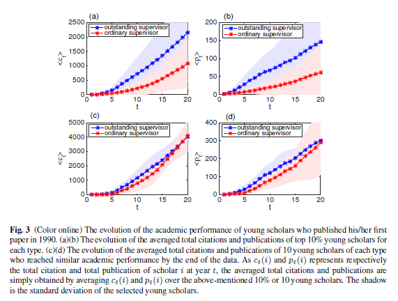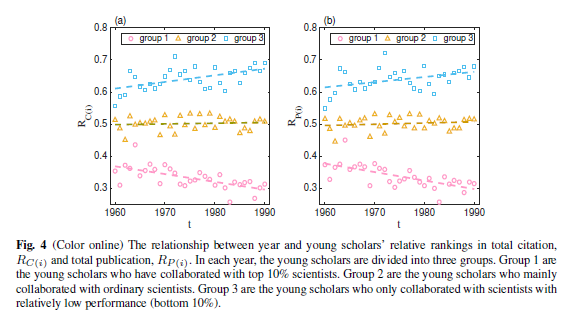 简介:合作是科学研究中很重要的一部分,随着各学科知识的不断积累,个体研究者只能成为某一领域的专家。因此,现在有越来越多合作形式的科学论文出现。科学计量学领域的许多工作都是致力于分析科学家合作网络的结构特点,然而对于这种合作会如何影响青年学者未来的科研职业生涯发展的研究是很少的。在这篇文章中,我们对美国物理学会(APS)从1893年至2009年的包括325491位作者和458584篇科学论文的实际数据进行了这一方面的分析。分析结果显示,与杰出学者(通过他们文章的总引用数量衡量)合作对青年学者的职业生涯发展有显著的积极影响,并且这种影响具有很强的非线性,可以被拟合为指数小于1的幂函数的形式。进一步的分析表明,这种对于青年学者的积极影响主要表现在其科学职业生涯的前期。同时经过比较1960年至1990年数据,可以发现这种影响是随着时间逐渐增强的。