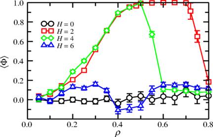 FIG. 4. Average order parameter as a function of the particle density, for θ=0, b=8, vd=6, and various values of the depth Hof the serrated region.
