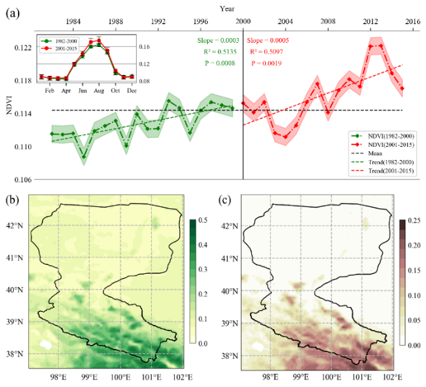 图1.黑河流域NDVI均值及其标准差的时间序列和空间分布。(a)为年均NDVI与月均NDVI的时间序列。阴影面积表示95 %的置信区间,误差棒表示±1SD。(b)和(c)分别表示1982-2015年NDVI空间均值和标准差。