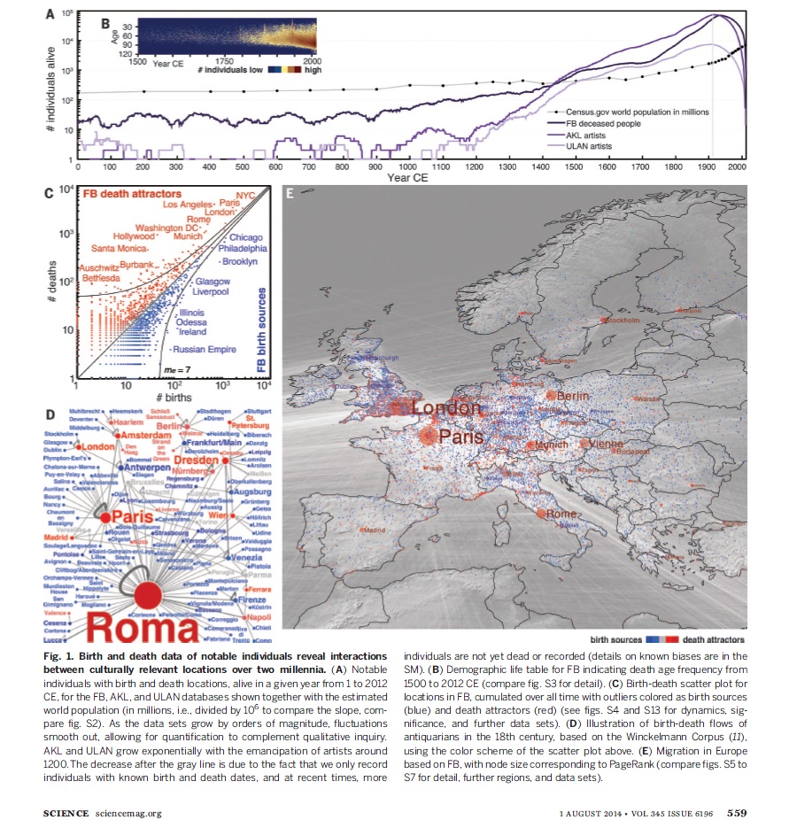 2014年8月1日发布的最新一期《科学》杂志刊登了美国学者Maximilian Schich的最新研究报告。笔者通过分析过去2000年来杰出人士出生和死亡地点的数据集,将定量与定性观点进行整合,从全新的角度分析了文化的流动性,该研究中所用的分析框架可能将促发人文科学领域更有力分析方法的引入。为了更好地理解在其它复杂文化过程中疾病的扩散、冲突的兴起以及城市的演变,研究人员需要一种定量分析个人历史发展对社会实践影响的方法,定性或定量的研究一直是该领域的常见方法。Maximilian Schich及其同事联合这两种方法来研究2000年来欧洲和北美的文化流动性。作为不同时代思想和技能流动的个体代表,研究人员描绘了超过15万名著名人物的迁徙模式,这些人的迁徙模式是用他们的出生和死亡地点来代表的,这份迁徙记录从希腊立法者和诗人梭伦(出生于公元前637年雅典,死于公元前557年塞浦路斯)到Jett Travolta(演员John Travolta的儿子,出生于1992年洛杉矶,死于2009年巴哈马),囊括了2000年来的不同领域的知名人士。Schich等人将来自物理学和生物学等领域的定量分析方法应用于这一数据集,揭示了某些地点随着时间而改变的个体“吸引力”模式,并指出这些模式偏差的历史相关性可用定性方法进行解释。该团队还使用这些数据创建了一段视频,从公元前600年到2012年,每个人的出生地点在地图上以蓝点标注,死亡地点以红点标注,在这个动态地图上,我们能看到文化历史的变迁,越多的名人在一个城市死亡,说明这个城市的文化、经济越繁荣昌盛。Schich的Birth to Death 迁移地图反映出了一些公认的历史事实,比如罗马作为文化中心被巴黎取代,但最终又被洛杉矶和纽约取代。研究人员指出,在没有其大规模可视化工具时进行分析的情况下,用他们的框架所揭示的连贯全球模式将有助于预测文化流动模型下一步的生长、体型、距离分布,从而更好地为解读文化现象提供指导。