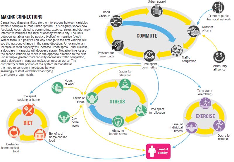 Causal-loop diagrams illustrate the interactions between variables within a complex human urban system. This diagram shows how feedback loops related to commuting, exercise, stress and diet may interact to inuence the level of obesity within a city. The links between variables can be positive (yellow) or negative (blue). Where there is a positive link, any change to the ‑rst variable will see the next one change in the same direction. For example, an increase in road capacity will increase urban sprawl, and, likewise, a decrease in capacity will decrease sprawl. Negative links cause the second variable to move in the opposite direction to the ‑rst. For example, greater road capacity decreases trac congestion, and a decrease in capacity makes congestion worse. The complexity of this portion of the system demonstrates the need to consider interactions between seemingly distant variables when trying to improve urban health.