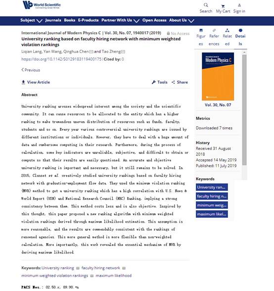 2018级硕士郎丽茜为第一作者的“University ranking on faculty hiring network with minimum weighted violation rankings”已于2019年8月在线发表(//www.worldscientific.com/doi/10.1142/S0129183119400175)。该文章在2018年重庆举行的第十四届全国复杂网络学术会议进行交流,经会议程序委员会评选,最后推荐发表于International Journal of Modern Physics C这一综合性期刊。