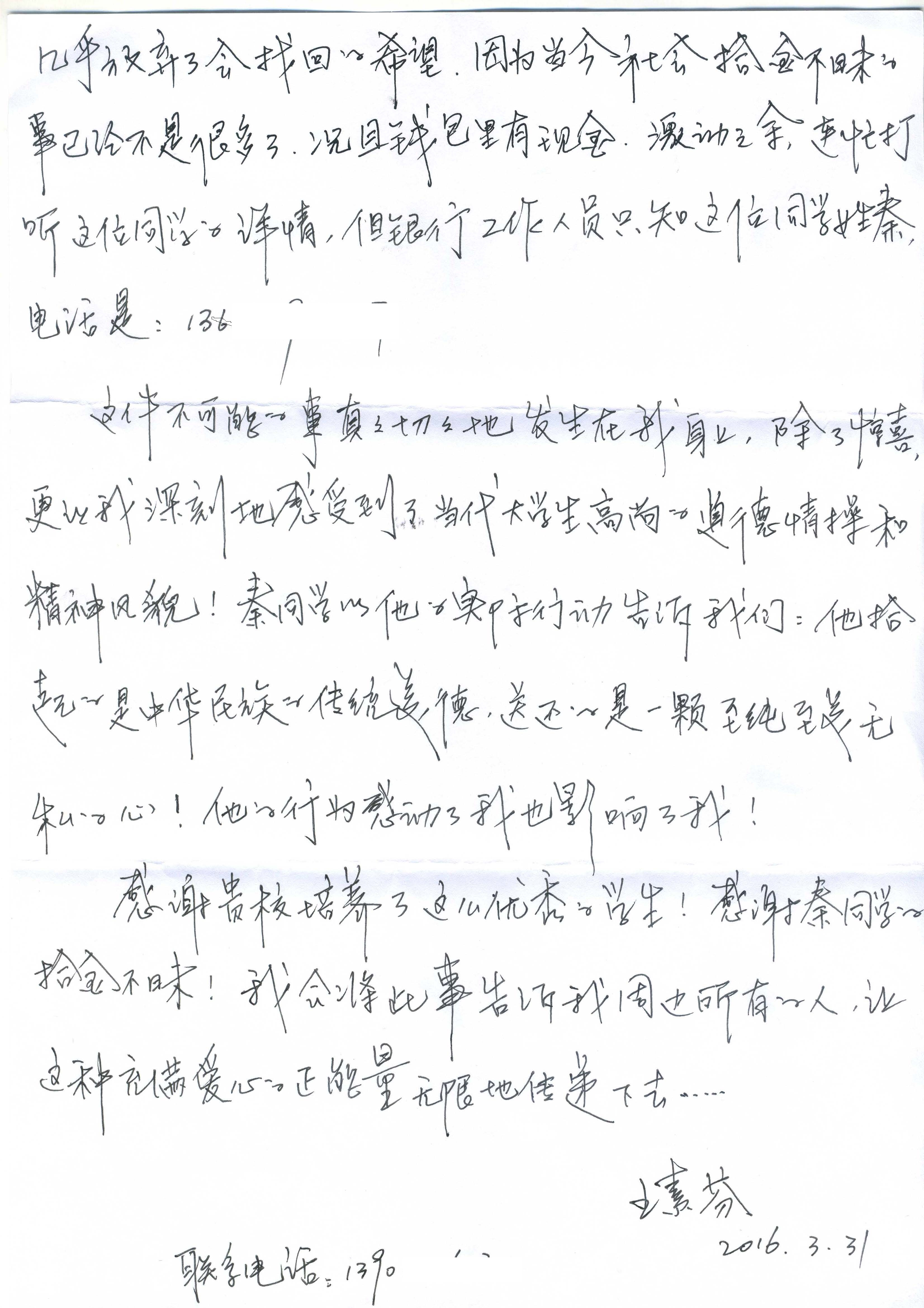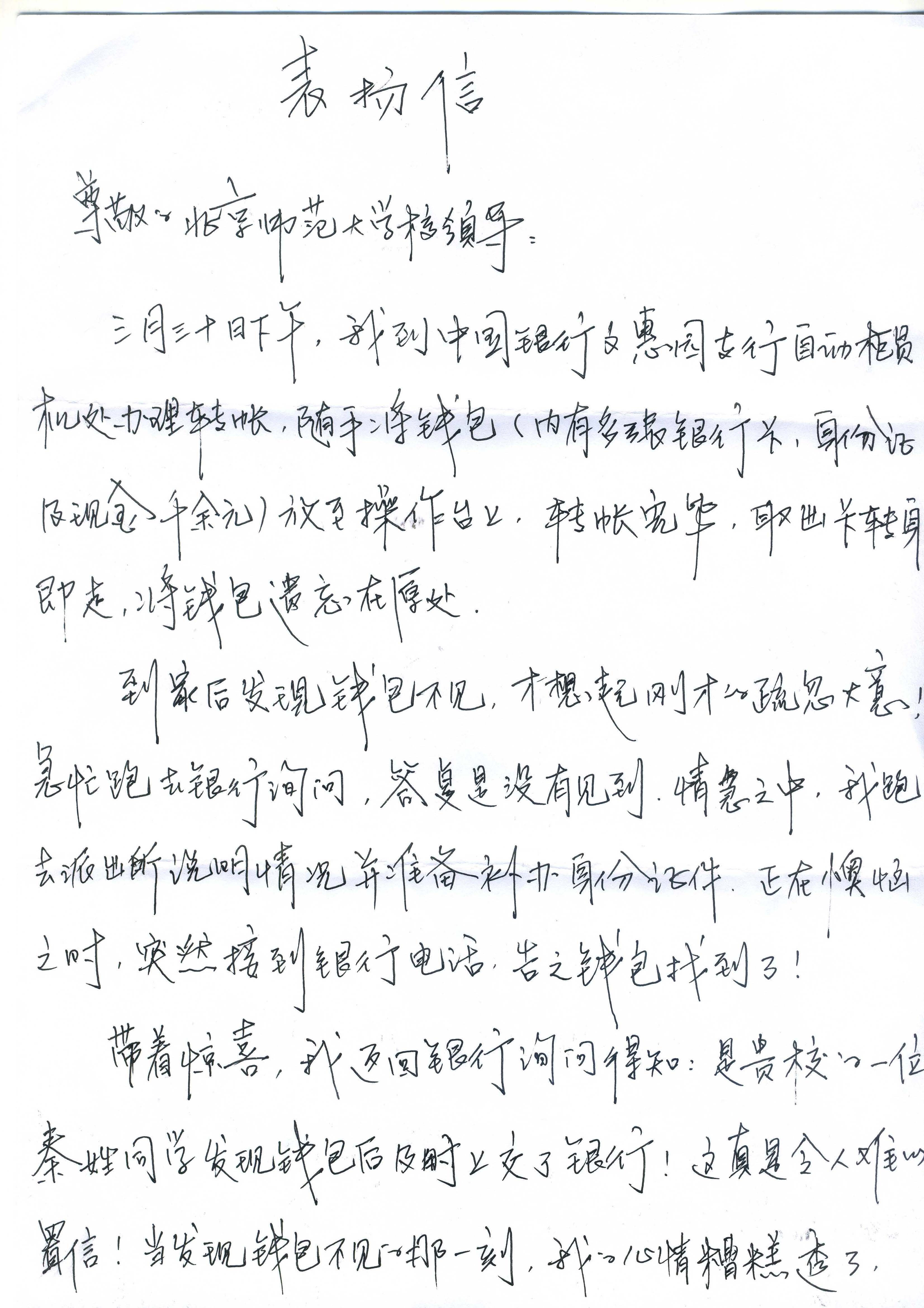 4月10日,经过辗转寻找,钱包失主王女士将感谢信送到swag免费影片 ,并对秦磊同学拾金不昧的行为表示赞扬和感谢。