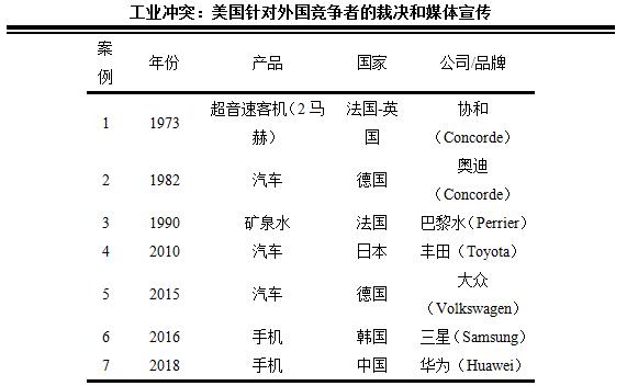 把注意力集中在这一个案例上是错误的,因为事实上还有许多其它类似的案例,即外国公司销售的产品,其销售受到美国政府、美国媒体宣传活动或(最常见的是)两者兼而有之的阻碍。下表列出了一系列的案例。