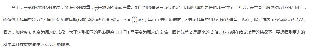 如你所知,由于地球的自转,一个坠落物体的运动方向会产生偏移。然而,这种影响很难观察到。要获得几厘米的偏差,坠落距离必须超过100米高。在这样一个距离上有许多扰动因素(例如空气的运动),使得实验相当不确定。