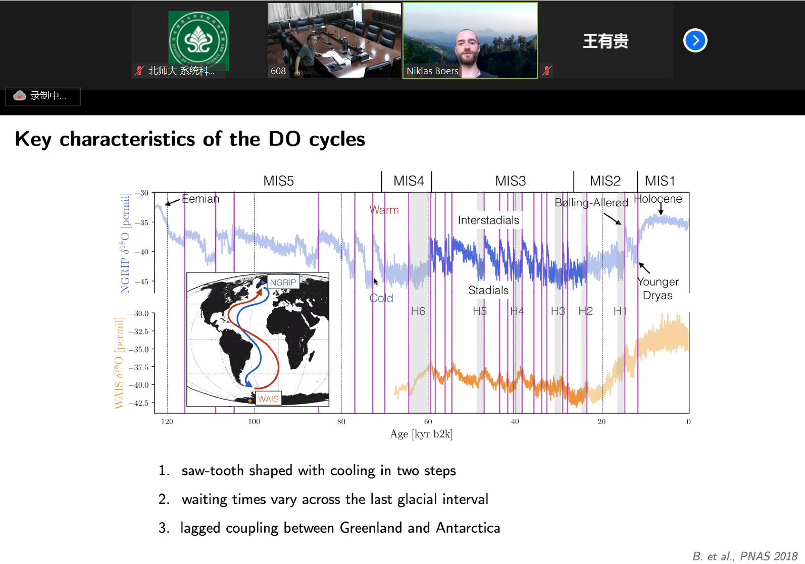 2020年6月22日下午,swag免费影片 邀请柏林洪堡大学理论物理学博士Niklas Boers为全院师生进行了主题为“Abrupt transitions in climate dynamics(气候动力学的突变)”的线上讲座。讲座由swag免费影片 院长陈晓松教授主持,科技楼B区608会议室作为线下会场开放,线上线下全院师生及外院研究人员50余人参与了讲座。