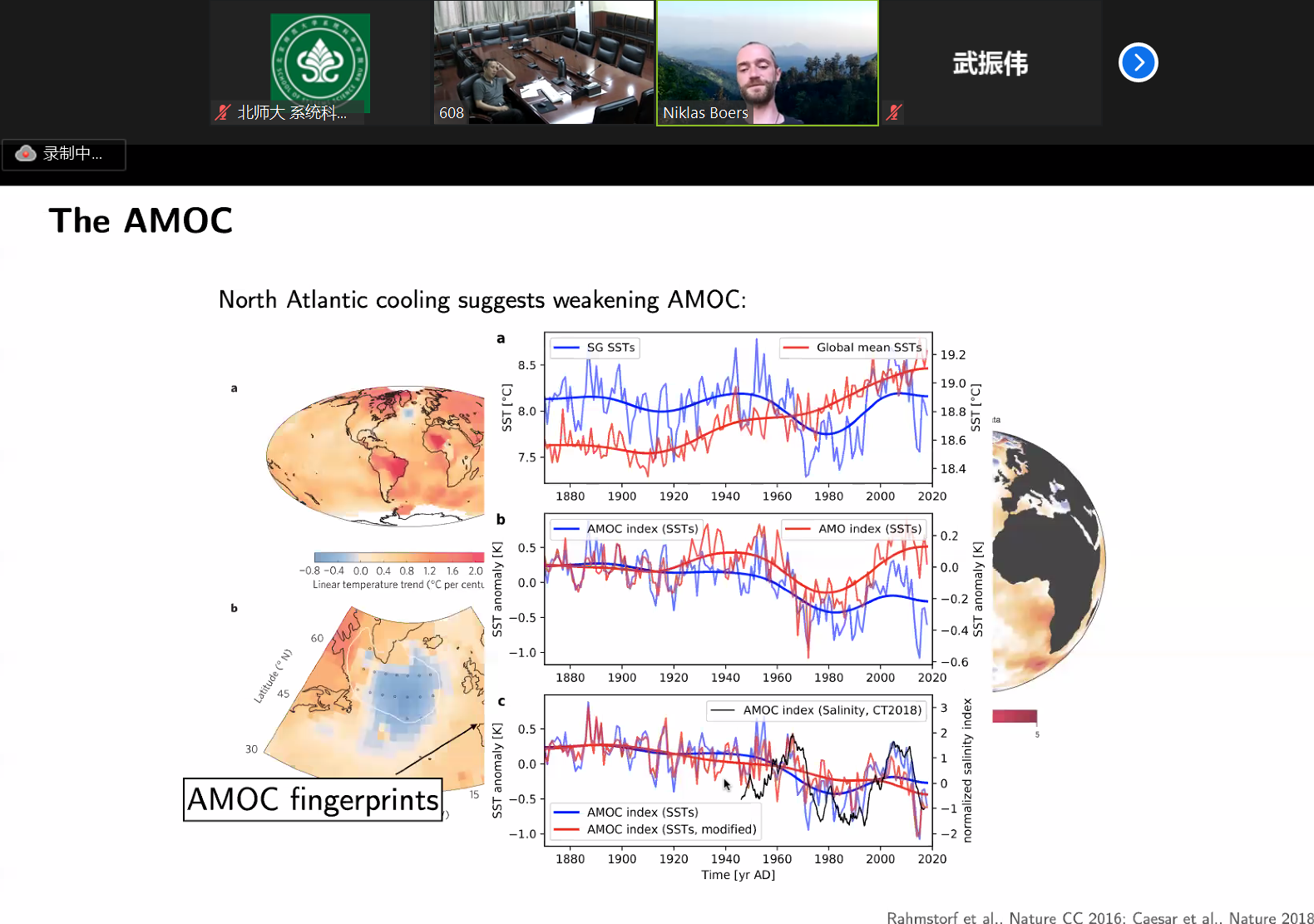 在本次讲座中,Niklas Boers博士介绍了根据过去气候动力学的一些代表记录证据表明,地球气候系统的几个组成部分可能会因强迫力的逐渐变化而突然改变其状态。包括:大西洋经向翻转环流(AMOC)、极地冰盖、亚马逊雨林和热带季风系统等几个关键案例。Niklas Boers博士总结了用随机动力系统研究这些子系统的最新结果,包括早期预警临界相变的可能指标;讨论了如何重建两个世纪以来格陵兰冰原融水径流,以及近来的增量和放大性反馈之间的关系;并将亚马逊热带雨林的复原看作一个随机动力系统,分析了南美洲热带地区的森林砍伐和降水模式的预期变化。