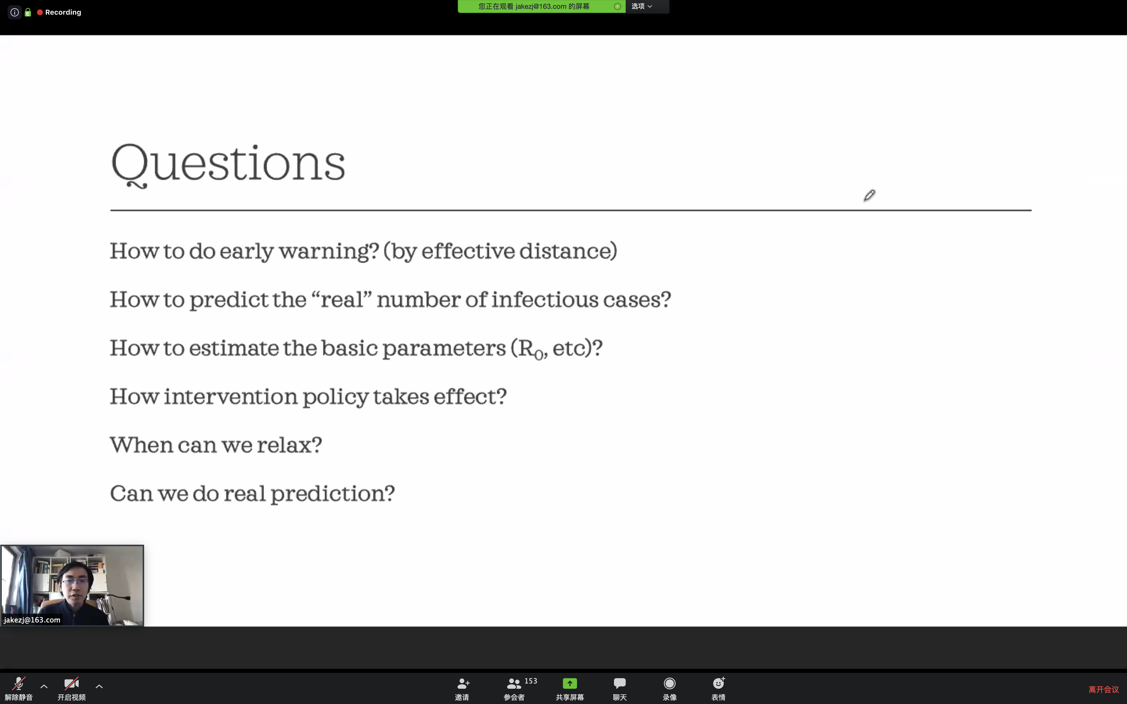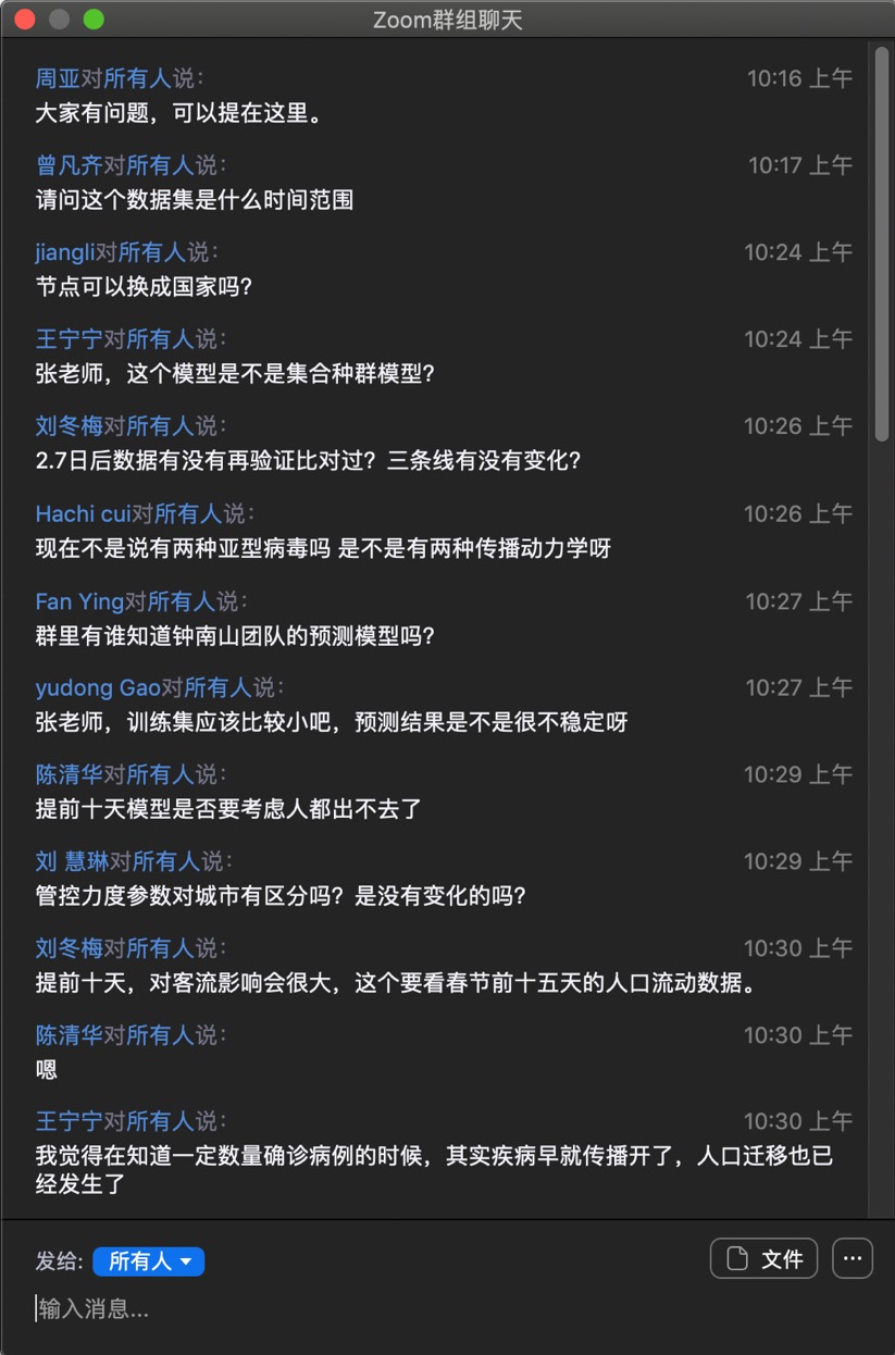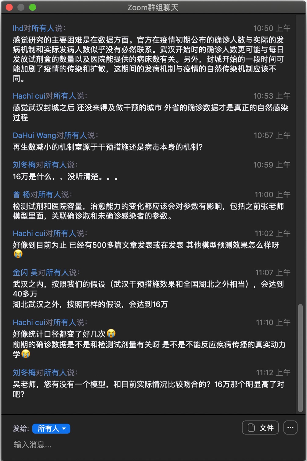 随后,与会的各位师生就这些问题展开了热烈讨论。swag免费影片 的陈晓松教授、狄增如教授、李红刚教授、韩战钢教授、斯白露教授、樊瑛教授、王大辉教授等,以及地理科学学部的汪明教授、叶谦教授都发表了精彩点评,对于如何提出与疫情相关的、有系统科学特点的科学问题,如何在数据有限的情况下提升科学决策水平,如何将系统科学与安全工程、应急管理相结合,提出了自己的见解与主张。会议的讨论区也收到了200多条留言,师生进行了充分讨论。