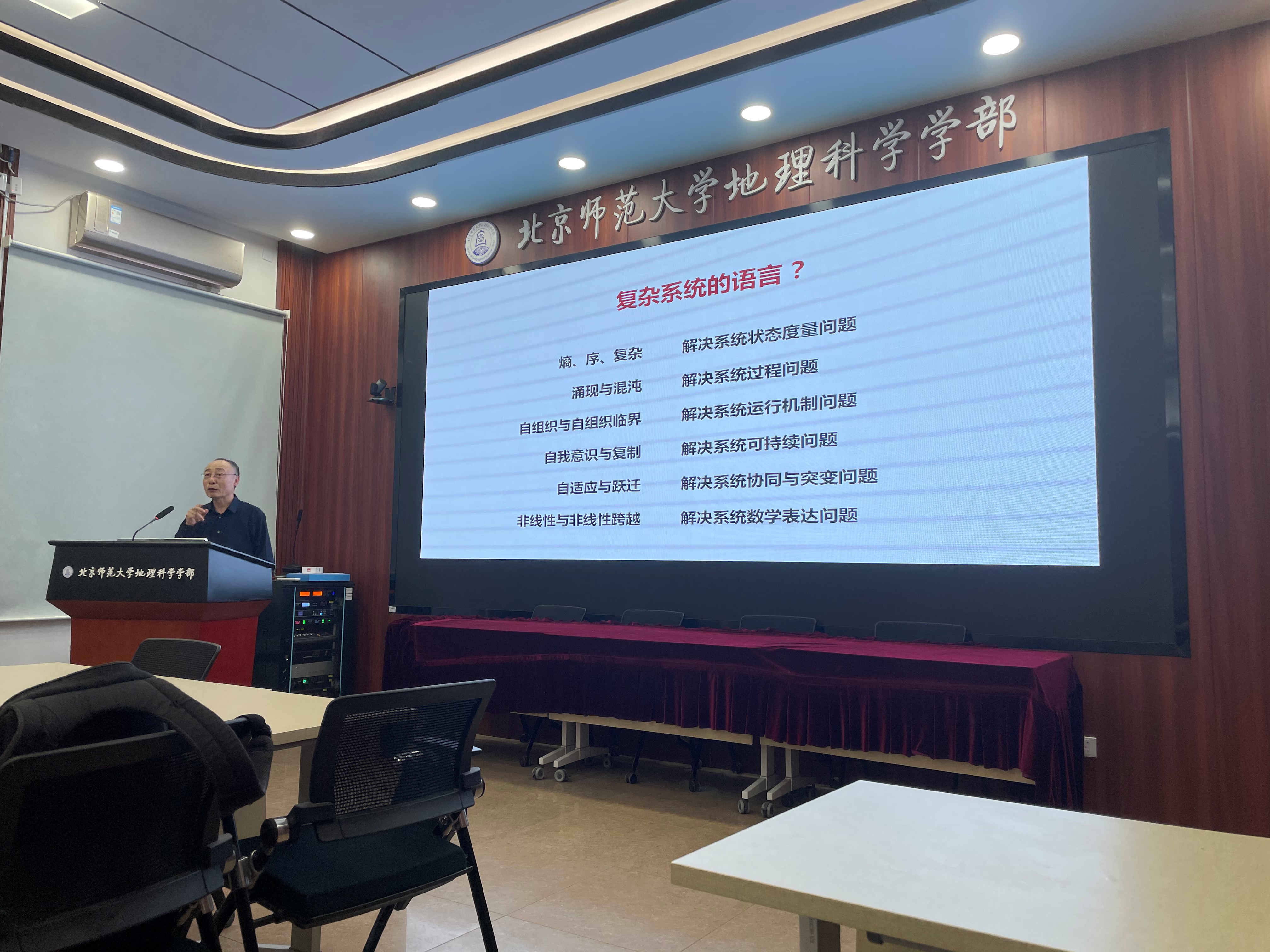 随后,参会老师结合各自工作领域作了学术报告,包括:宋长青部长的“地理复杂性的内涵”、陈晓松院长的“复杂系统理论和其在复杂系统中的应用”、延晓冬教授的“人地系统动力学模型系统”、樊京芳教授的“复杂系统的方法在地球物理系统中的应用”、徐同仁教授的“黑河流域的复杂系统观测模拟和多尺度相应”。