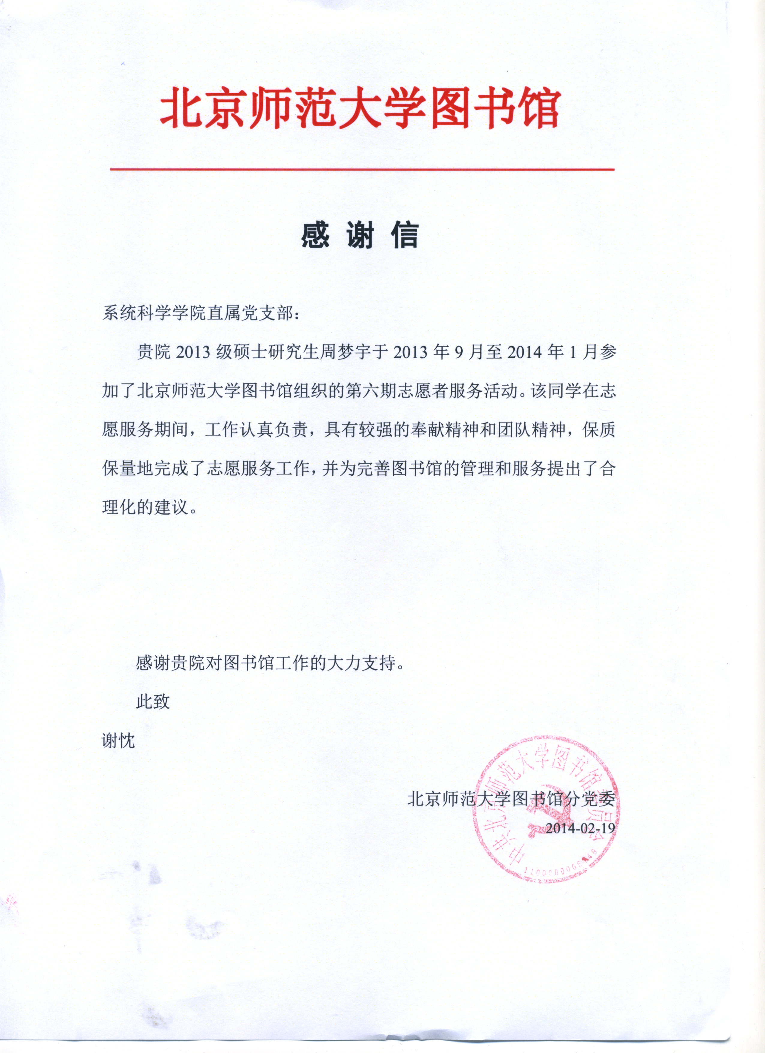 图书馆致信感谢swag免费影片 周梦宇同学的志愿服务