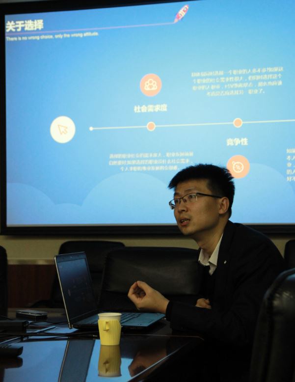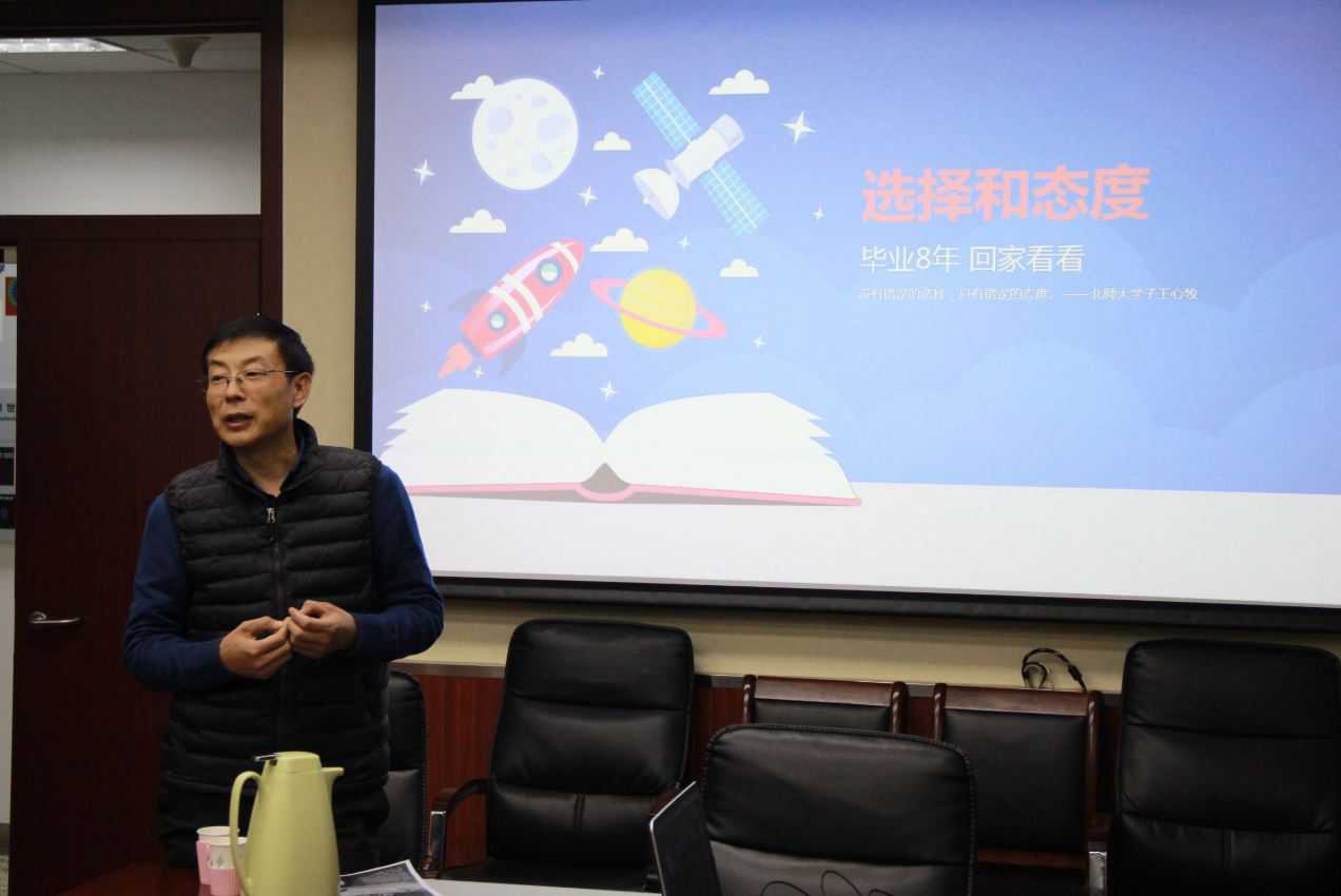 接着,王心牧学长以“选择和态度”为题,向大家介绍了银行业的传统业务和创新业务,并结合自己在招商银行十年的成长经历,给大家生动的上了“坚持与奋进、责任与成长”一课。王心牧学长告诉大家,“没有错误的选择,只有错误的态度”,同学们在对未来职业发展做规划时,要综合考虑社会需求度、求职竞争性、个人匹配度、职业发展潜力、环境因素和个人兴趣这几方面的因素,学长鼓励大家在走出校园前,要注意培养自身的综合素质和基本的职场素养。踏实奋进、持之以恒是师大学子的优良传统,学长希望在座的同学们将来能够在未来的职业发展中彰显师大学子的资质和系统院友的素养,青出于蓝而胜于蓝。